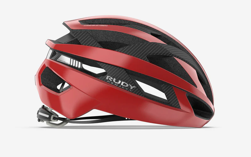 The Rudy Project Rebel cycling helmet sets a new standard in safety, sustainability, and performance. Designed with integrated carbon fiber panels, it enhances structural strength and comfort while reducing the amount of polystyrene (foam) required. This construction lowers overall weight and allows for larger ventilation openings—without compromising safety, and even improving it.